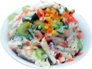 Penne pasta, diced red & green capsicum, celery, shredded carrot, corn kernel and chopped parsley with creamy mayonnaise dressing.