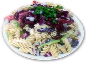 Weight Watchers delight! Spiral pasta, julienne green capsicum, red kidney beans, diced Spanish onion, corn kernels and shallots with a light & tangy dressing. Served chilled or hot 99% Fat Free